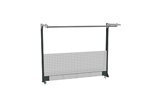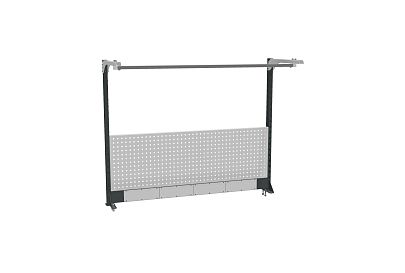 В комплекте короб для коммуникаций, перфорированная панель, комплект стоек боковых, 2 консоли и перекладина.