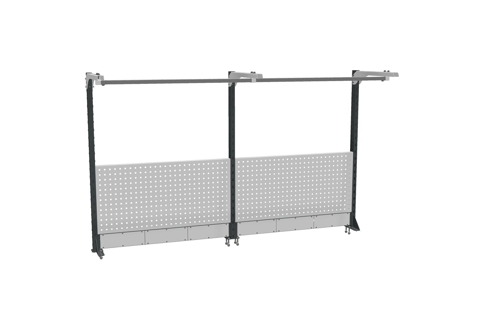 В комплекте 2 короба для коммуникаций, 2 перфорированные панели, центральная стойка и комплект стоек боковых, 3 консоли и перекладина.