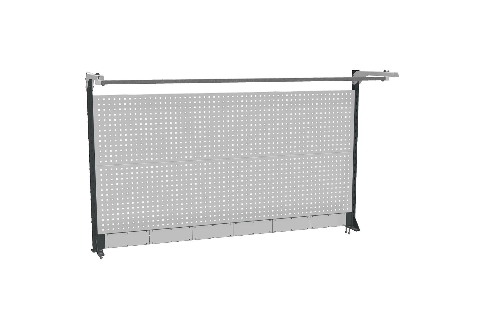 В комплекте короб для коммуникаций, 2 перфорированные панели, комплект стоек боковых, 2 консоли, перекладина.