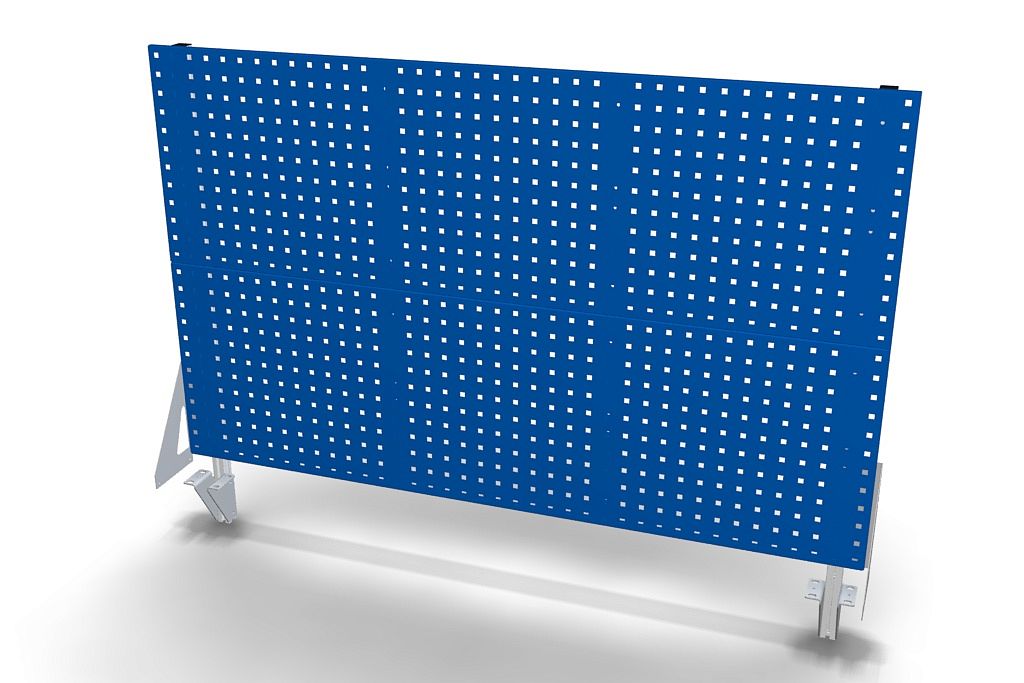 Панель перфорированная с квадратными отверстиями и рёбрами жёсткости на тыльной стороне. Укомплектована кронштейнами для крепления к столешнице верстака.
