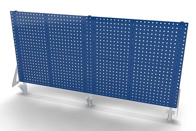 Панель перфорированная с квадратными отверстиями и рёбрами жёсткости на тыльной стороне. Укомплектована кронштейнами для крепления к столешнице верстака.