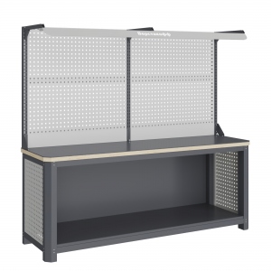 Экран (перфорированная панель) верстака выполнен с квадратной перфорацией 12х12 мм с шагом 38 мм для установки крючков, держателей и других аксессуаров. Экран крепятся к столешнице с помощью специальных кронштейнов. Максимальная масса груза, равномерно распределенного по поверхности экрана, составляет 71 кг.