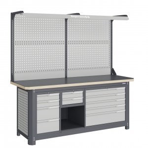 Экран (перфорированная панель) верстака выполнен с квадратной перфорацией 12х12 мм с шагом 38 мм для установки крючков, держателей и других аксессуаров. Экран крепятся к столешнице с помощью специальных кронштейнов. Максимальная масса груза, равномерно распределенного по поверхности экрана, составляет 71 кг.
