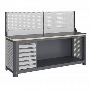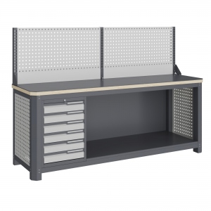 Экран (перфорированная панель) верстака выполнен с квадратной перфорацией 12х12 мм с шагом 38 мм для установки крючков, держателей и других аксессуаров. Экран крепятся к столешнице с помощью специальных кронштейнов. Максимальная масса груза, равномерно распределенного по поверхности экрана, составляет 71 кг.