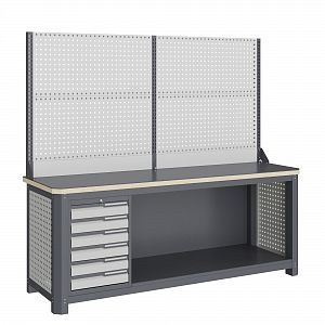 Экран (перфорированная панель) верстака выполнен с квадратной перфорацией 12х12 мм с шагом 38 мм для установки крючков, держателей и других аксессуаров. Экран крепятся к столешнице с помощью специальных кронштейнов. Максимальная масса груза, равномерно распределенного по поверхности экрана, составляет 71 кг.