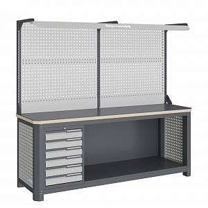 Экран (перфорированная панель) верстака выполнен с квадратной перфорацией 12х12 мм с шагом 38 мм для установки крючков, держателей и других аксессуаров. Экран крепятся к столешнице с помощью специальных кронштейнов. Максимальная масса груза, равномерно распределенного по поверхности экрана, составляет 71 кг.