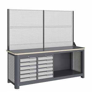 Экран (перфорированная панель) верстака выполнен с квадратной перфорацией 12х12 мм с шагом 38 мм для установки крючков, держателей и других аксессуаров. Экран крепятся к столешнице с помощью специальных кронштейнов. Максимальная масса груза, равномерно распределенного по поверхности экрана, составляет 71 кг.