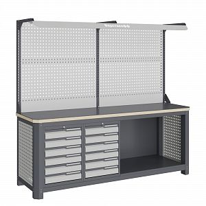 Экран (перфорированная панель) верстака выполнен с квадратной перфорацией 12х12 мм с шагом 38 мм для установки крючков, держателей и других аксессуаров. Экран крепятся к столешнице с помощью специальных кронштейнов. Максимальная масса груза, равномерно распределенного по поверхности экрана, составляет 71 кг.
