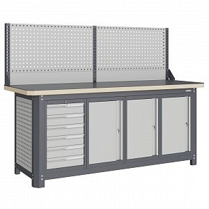 Экран (перфорированная панель) верстака выполнен с квадратной перфорацией 12х12 мм с шагом 38 мм для установки крючков, держателей и других аксессуаров. Экран крепятся к столешнице с помощью специальных кронштейнов. Максимальная масса груза, равномерно распределенного по поверхности экрана, составляет 71 кг.