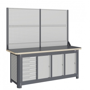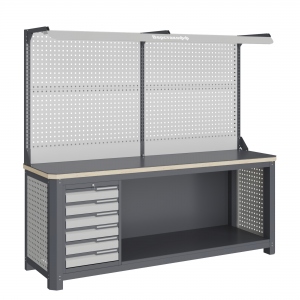 Экран (перфорированная панель) верстака выполнен с квадратной перфорацией 12х12 мм с шагом 38 мм для установки крючков, держателей и других аксессуаров. Экран крепятся к столешнице с помощью специальных кронштейнов. Максимальная масса груза, равномерно распределенного по поверхности экрана, составляет 71 кг.
