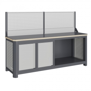 Экран (перфорированная панель) верстака выполнен с квадратной перфорацией 12х12 мм с шагом 38 мм для установки крючков, держателей и других аксессуаров. Экран крепятся к столешнице с помощью специальных кронштейнов. Максимальная масса груза, равномерно распределенного по поверхности экрана, составляет 71 кг.