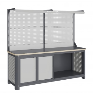 Экран (перфорированная панель) верстака выполнен с квадратной перфорацией 12х12 мм с шагом 38 мм для установки крючков, держателей и других аксессуаров. Экран крепятся к столешнице с помощью специальных кронштейнов. Максимальная масса груза, равномерно распределенного по поверхности экрана, составляет 71 кг.