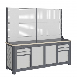 Экран (перфорированная панель) верстака выполнен с квадратной перфорацией 12х12 мм с шагом 38 мм для установки крючков, держателей и других аксессуаров. Экран крепятся к столешнице с помощью специальных кронштейнов. Максимальная масса груза, равномерно распределенного по поверхности экрана, составляет 71 кг.
