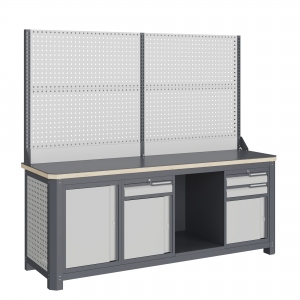 Экран (перфорированная панель) верстака выполнен с квадратной перфорацией 12х12 мм с шагом 38 мм для установки крючков, держателей и других аксессуаров. Экран крепятся к столешнице с помощью специальных кронштейнов. Максимальная масса груза, равномерно распределенного по поверхности экрана, составляет 71 кг.