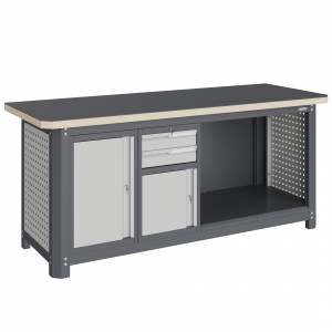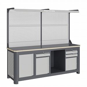 Экран (перфорированная панель) верстака выполнен с квадратной перфорацией 12х12 мм с шагом 38 мм для установки крючков, держателей и других аксессуаров. Экран крепятся к столешнице с помощью специальных кронштейнов. Максимальная масса груза, равномерно распределенного по поверхности экрана, составляет 71 кг.
