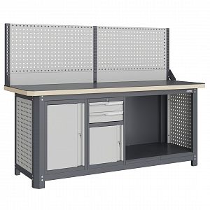 Экран (перфорированная панель) верстака выполнен с квадратной перфорацией 12х12 мм с шагом 38 мм для установки крючков, держателей и других аксессуаров. Экран крепятся к столешнице с помощью специальных кронштейнов. Максимальная масса груза, равномерно распределенного по поверхности экрана, составляет 71 кг.