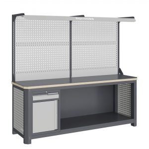 Экран (перфорированная панель) верстака выполнен с квадратной перфорацией 12х12 мм с шагом 38 мм для установки крючков, держателей и других аксессуаров. Экран крепятся к столешнице с помощью специальных кронштейнов. Максимальная масса груза, равномерно распределенного по поверхности экрана, составляет 71 кг.