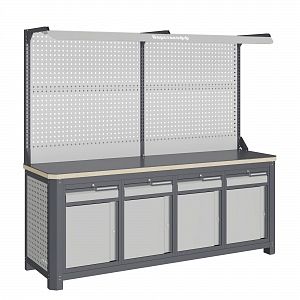 Экран (перфорированная панель) верстака выполнен с квадратной перфорацией 12х12 мм с шагом 38 мм для установки крючков, держателей и других аксессуаров. Экран крепятся к столешнице с помощью специальных кронштейнов. Максимальная масса груза, равномерно распределенного по поверхности экрана, составляет 71 кг.