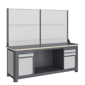Экран (перфорированная панель) верстака выполнен с квадратной перфорацией 12х12 мм с шагом 38 мм для установки крючков, держателей и других аксессуаров. Экран крепятся к столешнице с помощью специальных кронштейнов. Максимальная масса груза, равномерно распределенного по поверхности экрана, составляет 71 кг.
