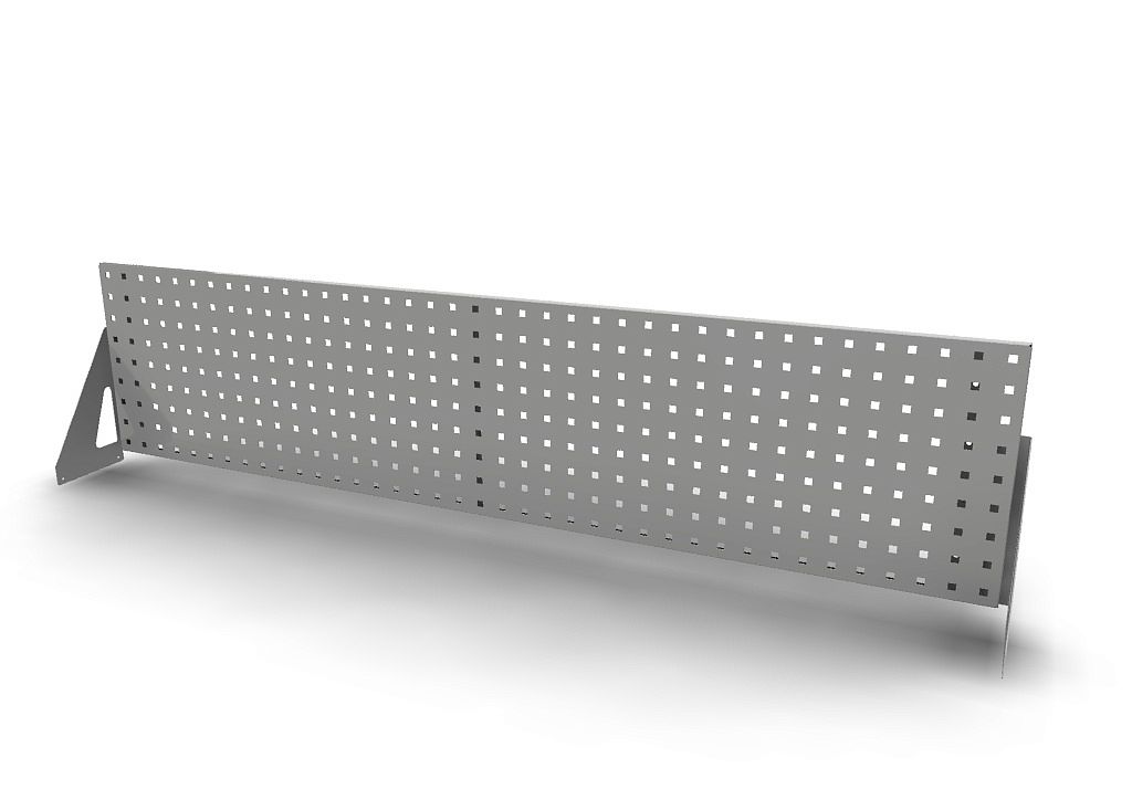 Панель перфорированная с квадратными отверстиями и рёбрами жёсткости на тыльной стороне. Укомплектована кронштейнами для крепления к столешнице верстака.