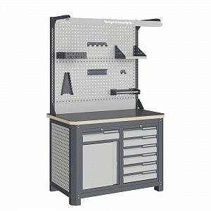 Экран (перфорированная панель) верстака выполнен с квадратной перфорацией 12х12 мм с шагом 38 мм для установки крючков, держателей и других аксессуаров. Экран крепится к столешнице с помощью специальных кронштейнов. Максимальная масса груза, равномерно распределенного по поверхности экрана, составляет 71 кг.