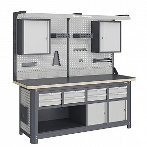 Экран (перфорированная панель) верстака выполнен с квадратной перфорацией 12х12 мм с шагом 38 мм для установки крючков, держателей и других аксессуаров. Экран крепятся к столешнице с помощью специальных кронштейнов. Максимальная масса груза, равномерно распределенного по поверхности экрана, составляет 71 кг.