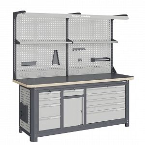 Экран (перфорированная панель) верстака выполнен с квадратной перфорацией 12х12 мм с шагом 38 мм для установки крючков, держателей и других аксессуаров. Экран крепятся к столешнице с помощью специальных кронштейнов. Максимальная масса груза, равномерно распределенного по поверхности экрана, составляет 71 кг.