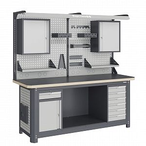 Экран (перфорированная панель) верстака выполнен с квадратной перфорацией 12х12 мм с шагом 38 мм для установки крючков, держателей и других аксессуаров. Экран крепятся к столешнице с помощью специальных кронштейнов. Максимальная масса груза, равномерно распределенного по поверхности экрана, составляет 71 кг.