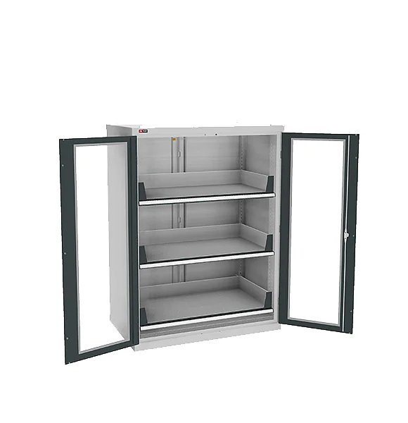 Надежный шкаф для хранения инструмента на производстве. Укомплектован дверьми с окнами, 3 выкатными платформами и системой антиопрокидывания. Нагрузка на платформу 200 кг. Общая максимальная нагрузка на шкаф — 1500 кг.