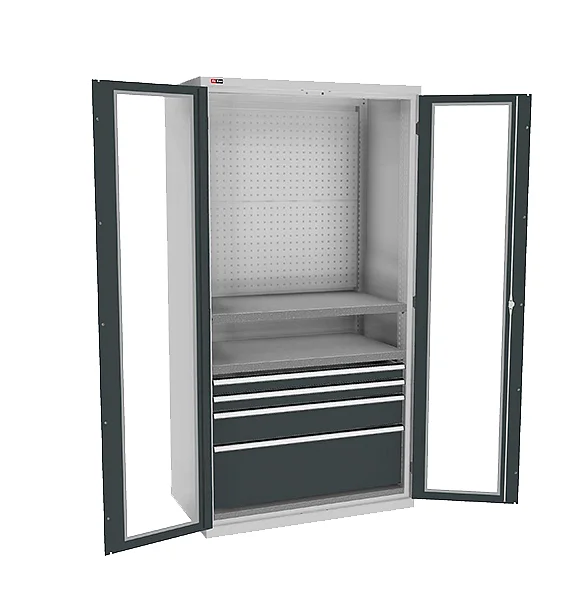 Укомплектован дверьми с окнами, 2 экранами для навески аксессуаров и держателей инструмента, 2 полками и 4 ящиками h 75, h 75, h 150, h 300. Нагрузка на полку 200 кг. Нагрузка на ящик 100 кг / 200 кг при установке второго комплекта направляющих (при h150 и более). Общая максимальная нагрузка на шкаф — 1500 кг.