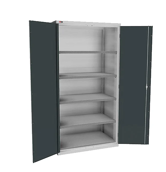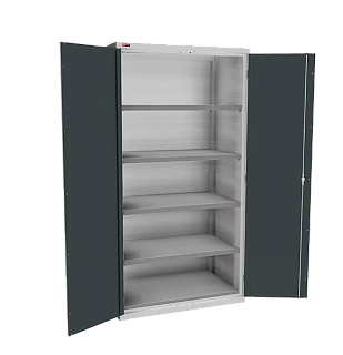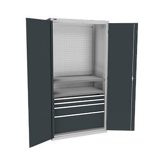 Надежный шкаф для хранения инструмента на производстве. Укомплектован дверьми глухими и 4 полками. Нагрузка на полку 200 кг. Общая максимальная нагрузка на шкаф — 1500 кг.
