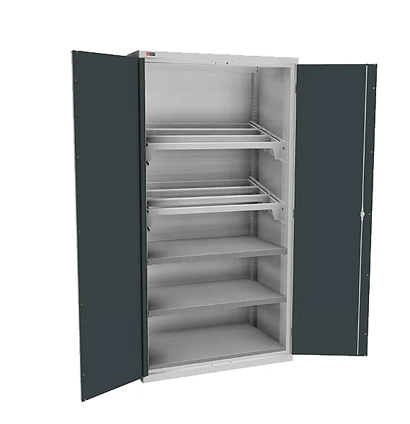 Надежный шкаф для хранения инструмента на производстве. Укомплектован дверьми глухими, 2 полками, 2 комплектами кронштейнов под салазки и 6 салазками под держатели инструмента. Держатели инструмента приобретаются отдельно. Нагрузка на полку 200 кг. Общая максимальная нагрузка на шкаф — 1500 кг.