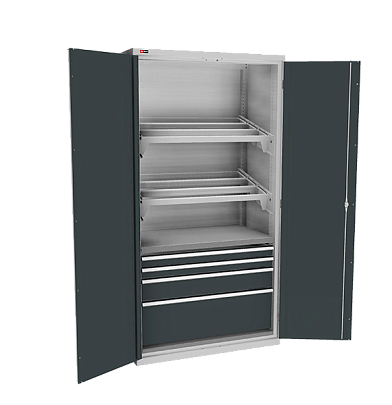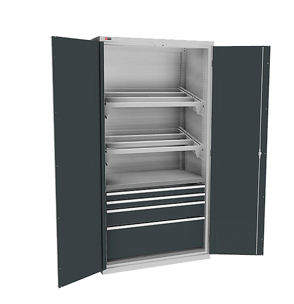 Надежный шкаф для хранения инструмента на производстве. Укомплектован дверьми глухими, 1 полкой, 2 комплектами кронштейнов под салазки, 6 салазками под держатели инструмента и 4 ящиками (h 75, h 75, h150, h300). Держатели инструмента приобретаются отдельно. Нагрузка на полку 200 кг. Нагрузка на ящик 100 кг / 200 кг при установке второго комплекта направляющих (при h150 и более). Общая максимальная нагрузка на шкаф — 1500 кг.