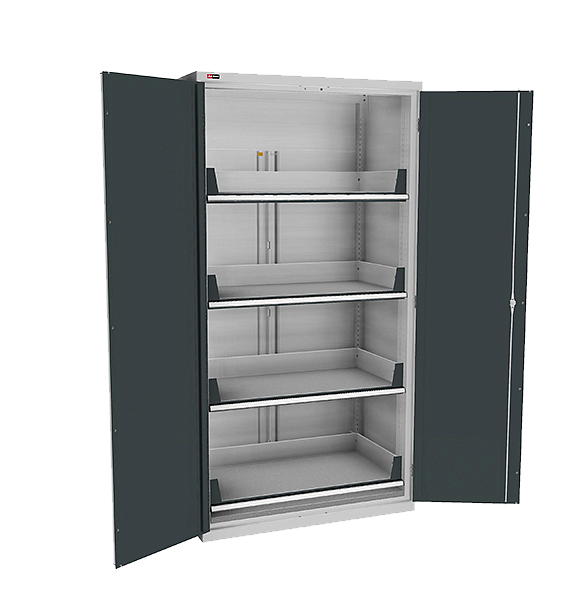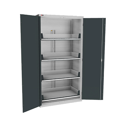 Укомплектован дверьми глухими, 4 выкатными платформами и системой антиопрокидывания. Нагрузка на платформу 200 кг. Общая максимальная нагрузка на шкаф — 1500 кг.