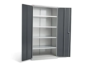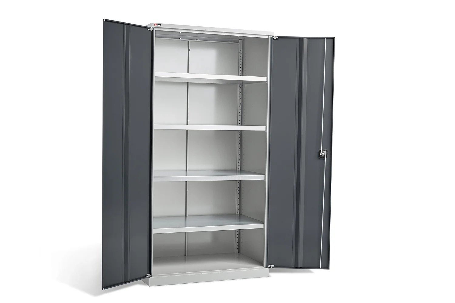 Укомплектован 4 оцинкованными полками. Нагрузка на полку 80 кг. Качественные комплектующие. Металлические оси и пластиковые петли - исключают трение металла об металл. Цвет дверей, фланцев ящиков и платформ RAL 7016 (антрацитово-серый). Цвет корпуса, корпуса ящиков, аксессуаров RAL 7038 (агатовый серый).