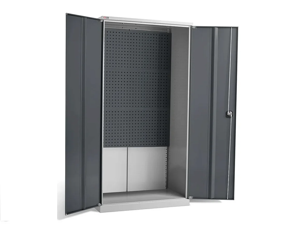 Предназначен для хранения инструмента в мастерских, на производстве или в гараже. Укомплектован 3 перфорированными экранами для размещения навесных аксессуаров, держателей инструментов. Качественные комплектующие. Цвет дверей, фланцев ящиков и платформ RAL 7016 (антрацитово-серый). Цвет корпуса, корпуса ящиков, аксессуаров RAL 7038 (агатовый серый).