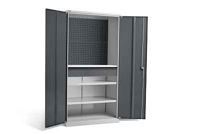 Укомплектован 2 перфорированными экранами, 3 оцинкованными полками, 1 выдвижным ящиком. Корпус ящика сварной. Нагрузка на ящик 60 кг. Нагрузка на полку 100 кг. Качественные комплектующие. Направляющие полного выдвижения. Цвет дверей, фланцев ящиков и платформ RAL 7016 (антрацитово-серый). Цвет корпуса, корпуса ящиков, аксессуаров RAL 7038 (агатовый серый).
