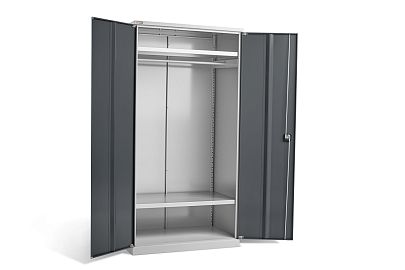Используется для хранения одежды на вешалках. Укомплектован 2 оцинкованными полками и комплектом гардеробным. Нагрузка на полку 100 кг. Цвет дверей, фланцев ящиков и платформ RAL 7016 (антрацитово-серый). Цвет корпуса, корпуса ящиков, аксессуаров RAL 7038 (агатовый серый).Качественные комплектующие.
