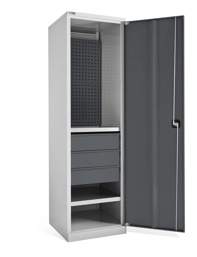 Укомплектован 2 перфорированными экранами, 2 оцинкованными полками, 3 выдвижными ящиками. Корпуса ящиков сварные. Нагрузка на ящик 30 кг. Нагрузка на полку 60 кг. Качественные комплектующие.