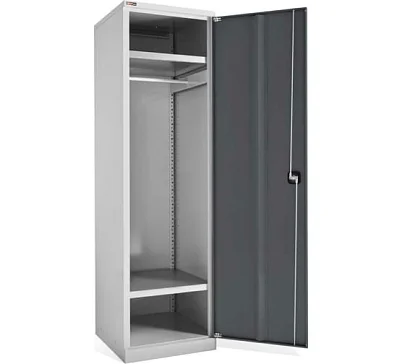 Укомплектован 2 оцинкованными полками и комплектом гардеробным.