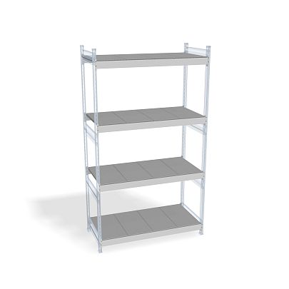 Балки окрашены порошковой краской, цвет серый RAL 7038. Полки двух вариантов: оцинкованные и окрашеные порошковой краской, цвет серый RAL 7038.