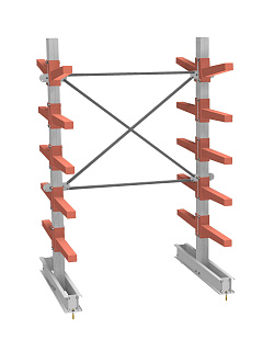 Мощный и удобный стеллаж для хранения длинномерных грузов — балок, труб, профилей, элементов конструкций. Каждая пара консолей выдерживает нагрузку до 1400 кг.