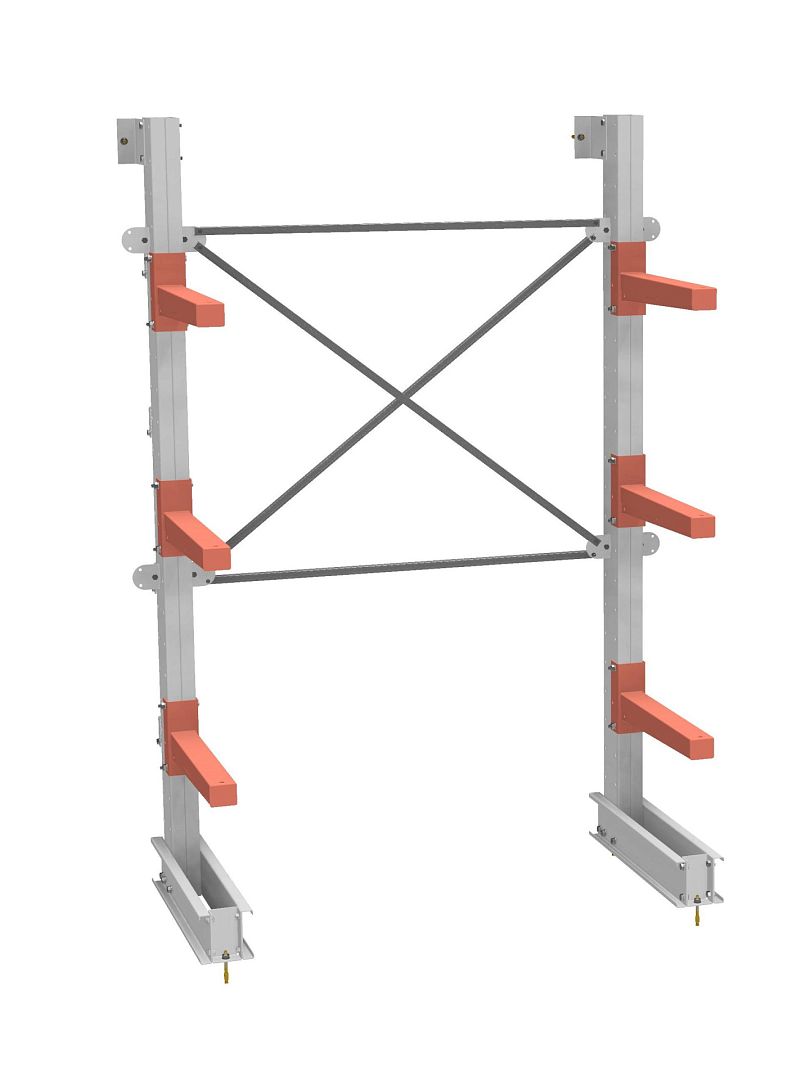 Мощный и удобный стеллаж для хранения длинномерных грузов — балок, труб, профилей, элементов конструкций. Каждая пара консолей выдерживает нагрузку до 1400 кг.