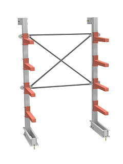 Мощный и удобный стеллаж для хранения длинномерных грузов — балок, труб, профилей, элементов конструкций. Каждая пара консолей выдерживает нагрузку до 1400 кг.