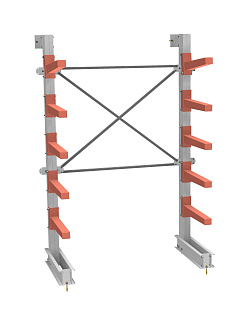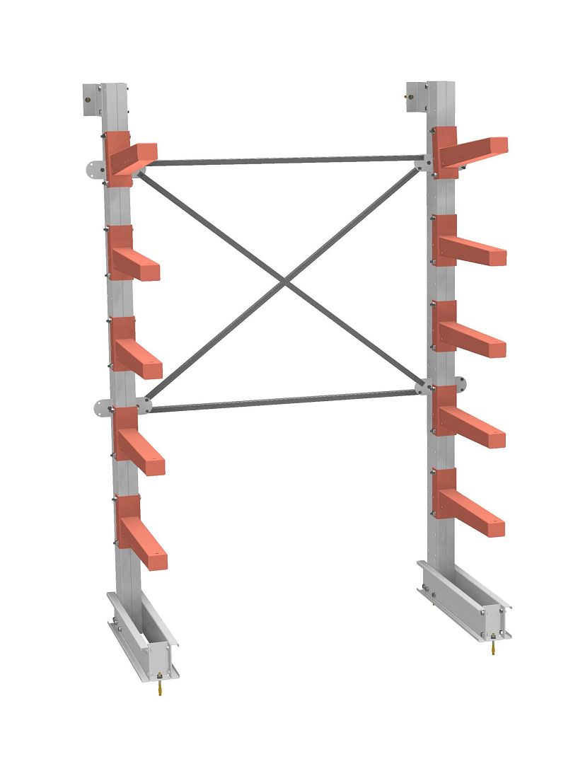Мощный и удобный стеллаж для хранения длинномерных грузов — балок, труб, профилей, элементов конструкций. Каждая пара консолей выдерживает нагрузку до 1400 кг.