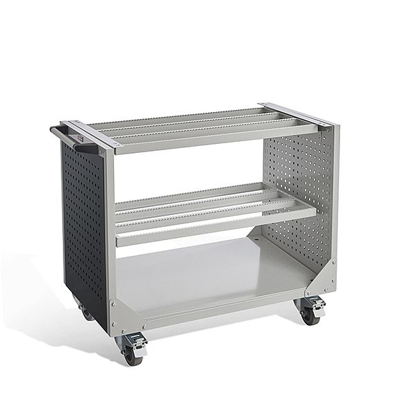 Надежная тележка для бережного хранения и перемещения инструмента и оборудования. В комплекте эргономичная боковая ручка и поворотные колеса TENTE (Германия), два колеса с тормозом и две рамы под держатели инструмента. Качественная резина на колёсах не оставляет чёрных следов. Максимальная нагрузка на тележку – 1000 кг.