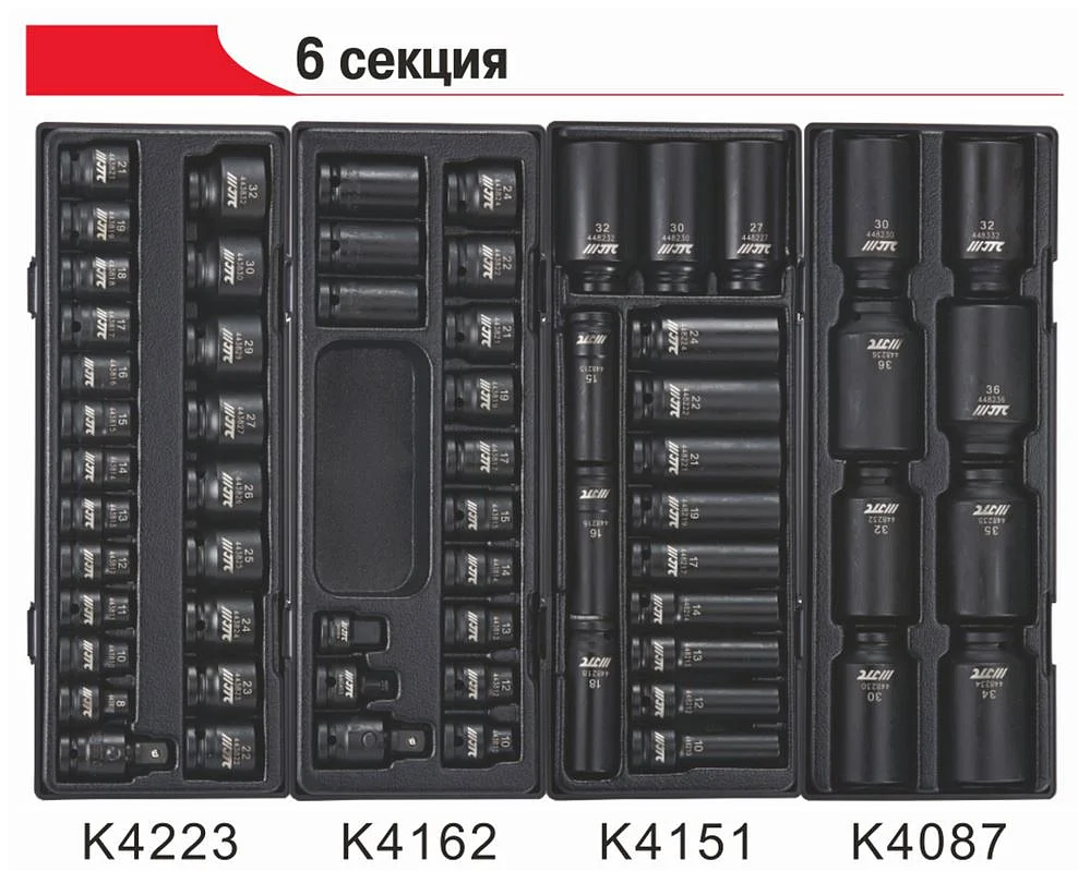 6-гранные головки глубокие ударные: 10, 12, 13, 14, 15, 16, 17, 18, 19, 21, 22, 24, 27, 30, 32 мм. - 15 шт.
