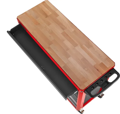 Верстак изготовлен из листовой коррозионностойкой стали с порошковым покрытием. Цвет - красный RAL 3020 и черный RAL 9005