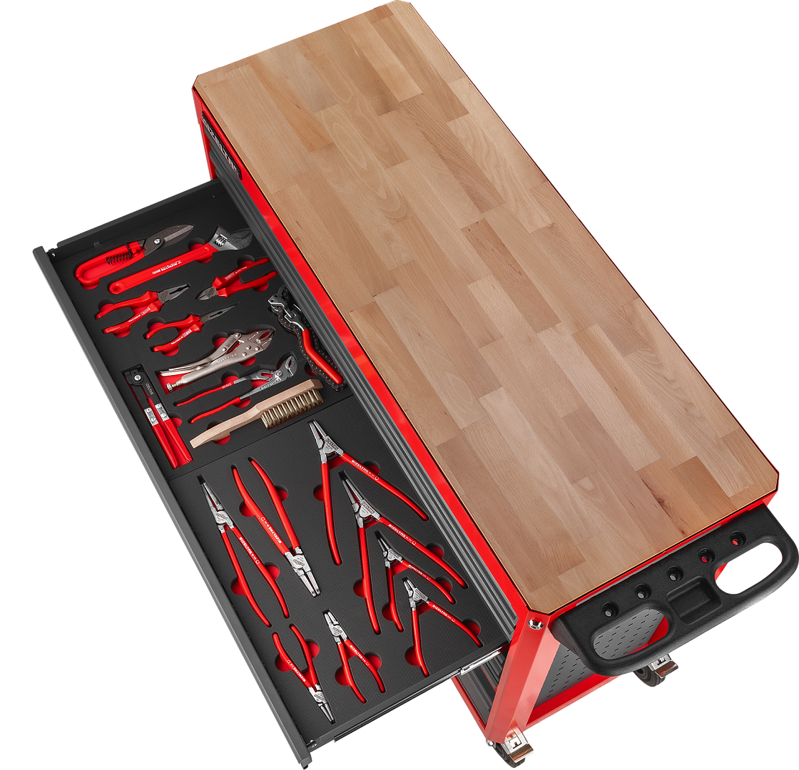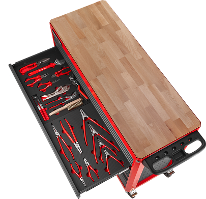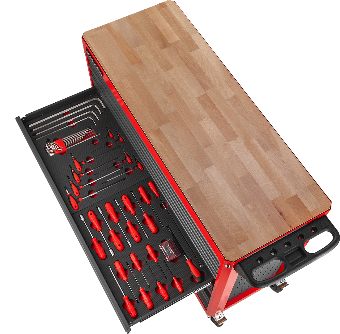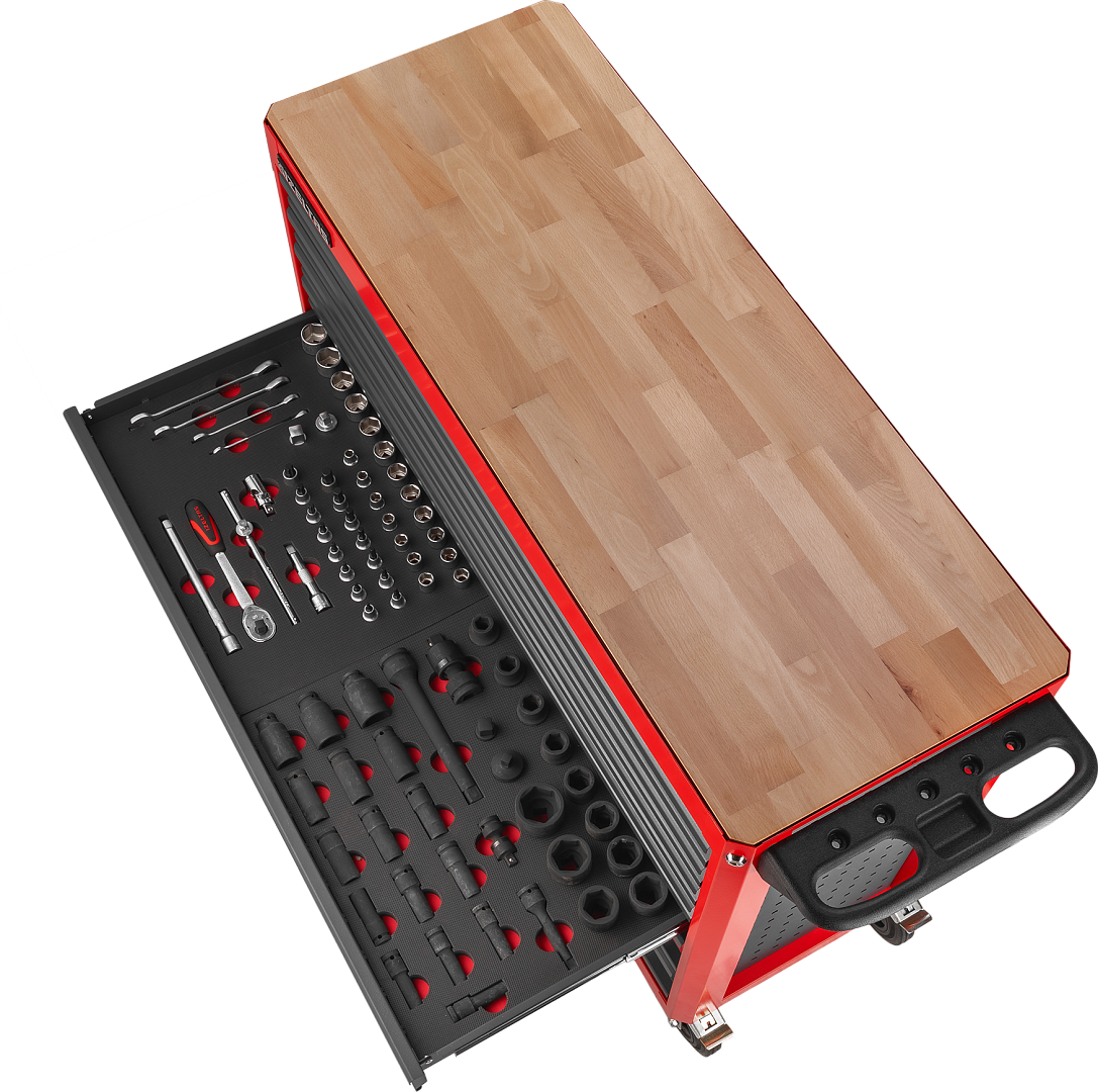 Тележка инструментальная (верстак) серии XXL без инструментов, деревянная столешница, 7 выдвижных ящиков, красно-черный, IZELTAS, 8246321007, 13000002478