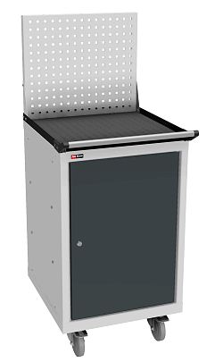 Тумба с распашной дверцей и двумя полками на колёсах для перемещения различных грузов/инструментов. Максимальная нагрузка на колёса — 1000 кг. Максимальная нагрузка на полку — 100 кг.
